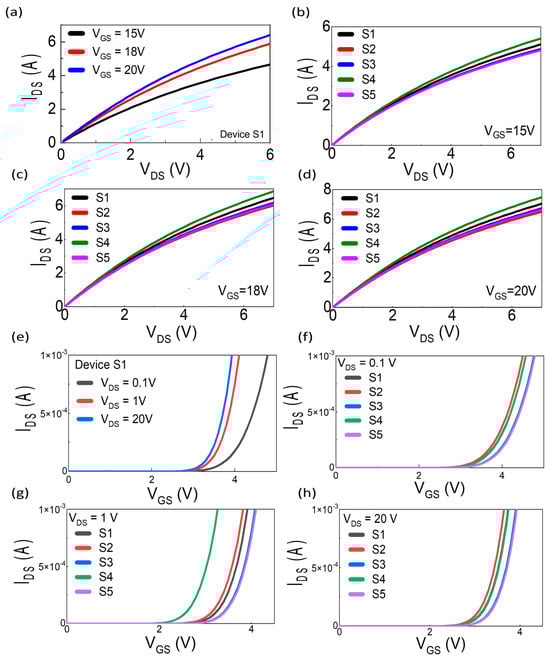(a) Output characteristics of Device S1 at various gate-source voltages (VGS = 15 V, 18 V, and 20 V). (b–d) Output characteristics of devices S1–S5 at VGS = 15 V, 18 V, and 20 V, respectively, showing trends in IDS versus VDS for multiple devices. (e) Transfer characteristics of Device S1 at VDS = 0.1 V, 1 V, and 20 V, illustrating the evolution of IDS with VGS within the same device, with Vth approximately 3.9 V for VDS = 0.1 V. (f–h) Transfer characteristics of multiple devices (S1–S5) at VDS = 0.1, 1 V, and 20 V, showing consistent IDS−VGS trends and minor variations in Vth (ranging from 3.9 V to 4.3 V).