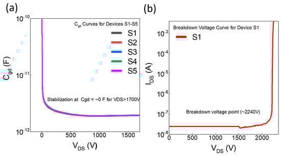 (a) The gate-drain capacitance (Cgd) characteristics of the five devices (S1–S5) measured at a test frequency of 100 kHz and a temperature of 25 °C. The plot reveals a sharp reduction in Cgd with increasing VDS, leveling off to an almost constant low value at higher voltages. (b) Breakdown voltage characteristics of device S1 were measured, highlighting the relationship between IDS and VDS, and indicating 2240 V as a breakdown voltage point, at which drain current rises rapidly.