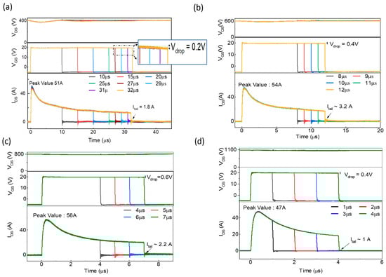 Drain-source voltage (VDS), gate-voltage (VGS) and SC current (IDS) waveforms of devices SC1–SC4, tested under various VDS, during normal operation, before failure: (a) Device SC1 tested under 400 V, with VGS drop highlighted in the inset; (b) Device SC2 tested under 600 V, (c) Device SC3 tested under 800 V, and (d) Device SC4 tested under 1100 V.