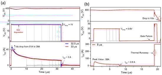 Figure 5 illustrates the progression of failure in Device SC1 and Device SC3 under 400 V and 800 V stress, respectively. The SC1 device demonstrated gate degradation as a failure mode under a stress condition of 400 V as shown in Figure 5a. This is evidenced by the gradual decline in IDS and an incremental drop in VGS, indicative of stress-induced damage to the gate oxide [31,32]. At SC pulse width (Tsc) = 32.5 µs, the initiation of gate degradation becomes apparent, marked by a small but noticeable decline in VGS, accompanied by a reduction in IDS. This simultaneous behavior reflects the onset of stress-induced damage to the gate dielectric and its impact on the device’s current conduction capability.