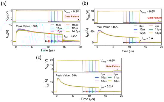 In the SC process, high local temperatures and the intensive electric field applied to the gate oxide cause higher leakage currents in the gate. Consequently, the VGS of devices decreases gradually as the duration of the SC pulse (TSC) increases. As the SC pulse width extended to 32 μs, a tail current (Itail) of approximately 1.8 A began to appear, accompanied by a minor reduction in VGS of 0.2 V. This small VGS drop indicates the robustness of the gate drive circuit, which maintains high stability throughout operation. It is noteworthy that this reduction in VGS does not begin immediately after the short circuit starts but becomes more pronounced as TSC progresses, consistent with known gate degradation mechanisms. The inset in Figure 4a highlights this behavior, showing a VGS drop of 0.2 V during the final pulse before failure.