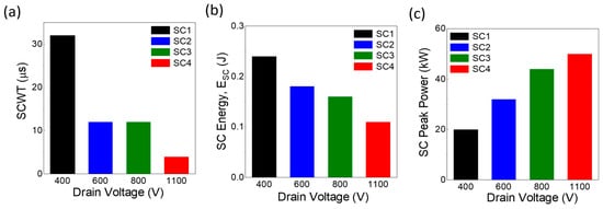 Short-circuit (SC) performance metrics under varying VDS (ranging from 400 V to 1100 V): (a) SCWT, (b) SC energy, and (c) SC peak power.