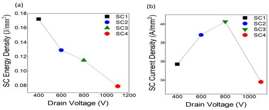 Short-circuit (SC) performance metrics under varying VDS (ranging from 400 V to 1100 V): (a) SC energy density and (b) SC current density.