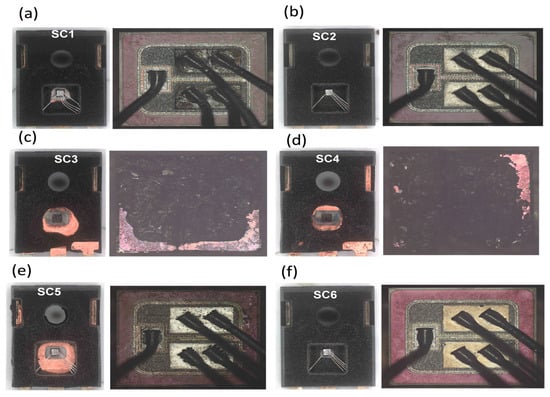 Devices SC5 and SC6 (Figure 9e,f), tested at 600 V under varying VGS conditions (−5/16 V and −5/18 V), exhibit intermediate damage levels, similar to SC2. However, SC5 shows greater physical damage than SC6, attributed to its longer SCWT (14 µs compared to 12 µs).