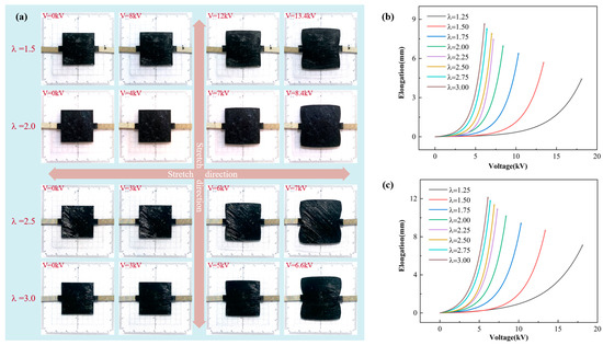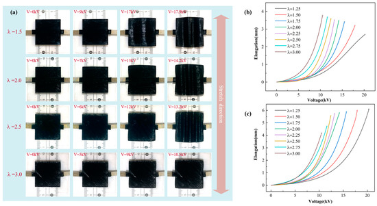 - Under uniaxial stretching, the deformation of the DEA in the stretching direction gradually increases and decreases in the unstretched direction with the increase in the pre-stretch ratio. Under biaxial stretching, DEA deformation increases with the increase in the pre-stretch ratio.