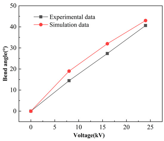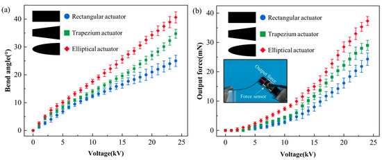 - The bending angle curve and output force curve after applying voltage to the elliptical DEA show that the elliptical DEA can produce a maximum bending deformation of 40° and an output force of 37.2 mN at a voltage of 24 kV.