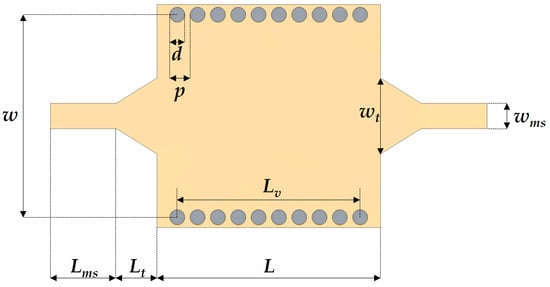 where is the center-to-center distance between the two via rows, is the diameter of a via, and is the pitch between the vias. Equation (2) offers high accuracy for conditions where and []. In addition, for ensuring reasonably small radiation losses due to energy leakage through gaps between vias, the condition should be satisfied [].