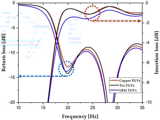 The HFSS simulations were conducted to obtain frequency characteristics over the range of 10 to 35 GHz, and the resulting S-parameters are shown in Figure 3. The left y-axis denotes the return loss, while the right y-axis indicates the insertion loss. From 20 to 35 GHz, the SIW with tin TGVs exhibited an average insertion loss of 0.76 ± 0.18 dB, closely matching the 0.74 ± 0.16 dB of the SIW with copper TGVs. In comparison, the SIW with pure low-resistive silicon TGVs demonstrated a significantly higher average insertion loss of 1.2 ± 0.17 dB. Despite the conductivity of tin being an order of magnitude lower than that of copper, the SIW with tin TGVs achieved comparable insertion loss values, with only a slight increase observed above 30 GHz. As expected, the SIW with tin TGVs outperformed the SIW with silicon TGVs in terms of electrical performance.