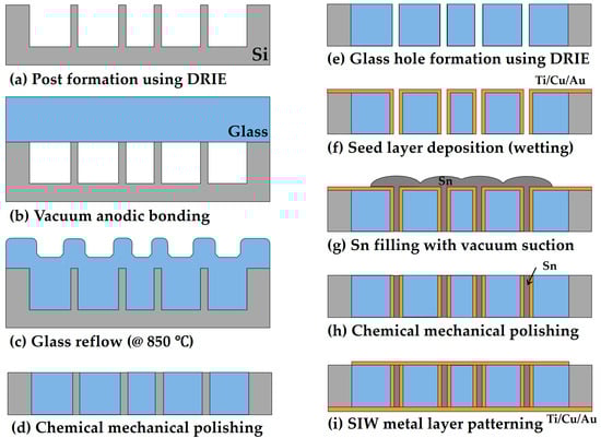 The overall fabrication process for the proposed SIW is based on micromachining processes. Figure 4 illustrates the process flow of the SIW with tin TGVs. The process begins with deep reactive ion etching (DRIE) of a 4-inch silicon wafer with a thickness of 0.5 mm to form cavities that accommodate the melted glass during the glass reflow process (Figure 4a). To achieve the necessary etch selectivity for deep etching of more than 400 µm, a 12.1-µm-thick AZ P4620 photoresist layer was patterned onto the wafer using photolithography, serving as the etch mask for DRIE. The silicon wafer, etched to a depth of approximately 420 µm, was bonded with a Borofloat-33 glass wafer using anodic bonding (EVG 501 anodic bonder, EV Group, St. Florian am Inn, Austria) (Figure 4b). Since anodic bonding was performed in a vacuum chamber at 1.5 × 10−4 Torr, the cavity formed between the silicon and glass also remained under vacuum. The bonded wafer was subsequently heated in an atmospheric furnace at 850 °C. During this stage, the pressure difference between the atmospheric pressure and the vacuum inside the sealed cavity caused the glass to reflow into the silicon cavities (Figure 4c). After cooling, chemical mechanical polishing (CMP) was applied to create a glass substrate embedded with silicon TGVs (Figure 4d). The silicon via region of the fabricated substrate was then removed by DRIE to produce empty TGV holes (Figure 4e).