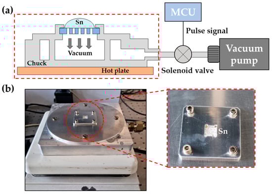 Vacuum suctioning system for fabricating tin TGVs: (a) Schematic view of the vacuum suctioning system. (b) Image of the vacuum suction chuck.