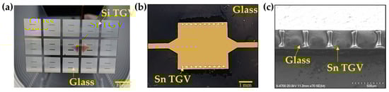 Figure 6 presents the results of the fabrication process. Figure 6a shows an image of the wafer taken after CMP of the glass-reflowed substrate (Figure 4d), illustrating that the silicon TGVs are accurately embedded in the glass at their designed locations. Figure 6b displays the image of the fabricated SIW with tin TGVs after all fabrication steps have been finished. To confirm the absence of voids in the tin-filled TGVs, a cross-sectional image of the specimen was captured using a field-emission scanning electron microscope (FE-SEM). Figure 6c verifies that the tin TGVs are completely filled with no voids present.