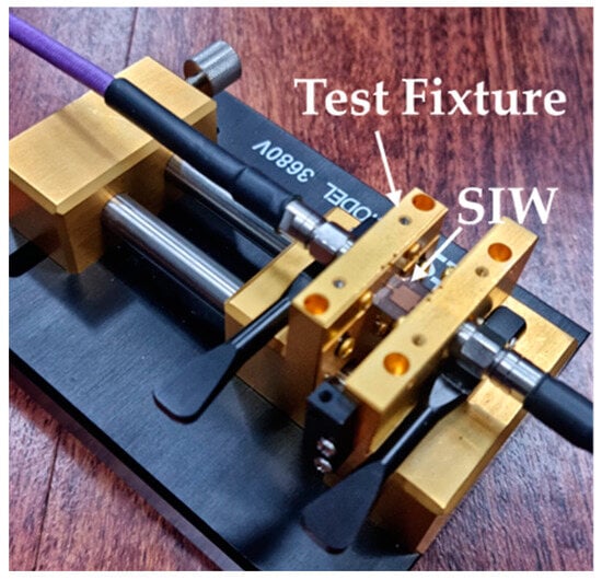 The frequency characteristics of the fabricated SIW were measured using a commercial test fixture (3680V, Anritsu Corp., Atsugi, Japan) and a vector network analyzer (N5227B, Keysight Technologies, Santa Rosa, CA, USA). Figure 7 shows the SIW mounted on the test fixture. A standard short-open-load-thru (SOLT) calibration process was performed using a commercial calibration kit (36804B-10M, Anritsu Corp., Japan).