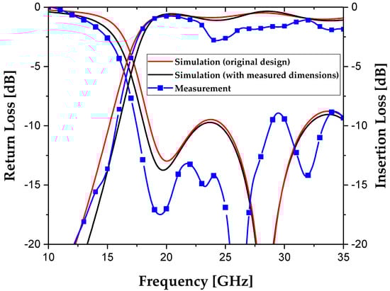Before measuring the RF performances of the fabricated SIW, the dimensional parameters of the specimen were measured and compared with the designed values, as shown in Table 1. The dimensions of the top metal patterns, including microstrip lines and transitions of the SIW, which were determined by photolithographic process, showed relatively small variations. The largest deviation was observed in the diameter of the vias, which is related to the initial DRIE process used to form the cavities in the silicon wafer (Figure 4a). The diameter of the tin via (d) was found to be approximately 60 μm smaller than the designed value. This indicates that the diameter of the silicon post structures for the TGV holes was reduced during the first DRIE step. This reduction is primarily due to the faster erosion of the photoresist etch mask at the edges of the silicon posts compared to the center part during the extended DRIE process. Since dimensional deviations can influence the RF characteristics of millimeter-wave devices, where high dimensional accuracy is required, an EM simulation was conducted again using these measured parameters.