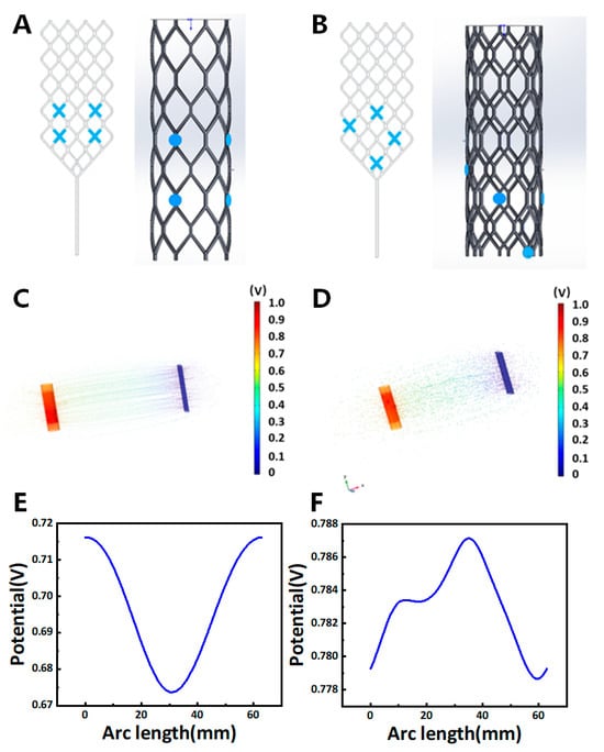 The simulation of the relative position design for the micro-wire stent electrode employed three different models to evaluate electrode configurations. (A,B): the blue “×” and disks represent the positions of the working electrodes. In models A and B, the grounding electrode is configured as a large rectangular pad measuring 7 × 2 × 30 (C,D): the 3D surface streamline potential maps display the potential distribution after electrical stimulation in each of the three models; (E,F): the potential distribution maps correspond to the working electrode plane, which is defined as a circular area with a radius of 10 mm.
