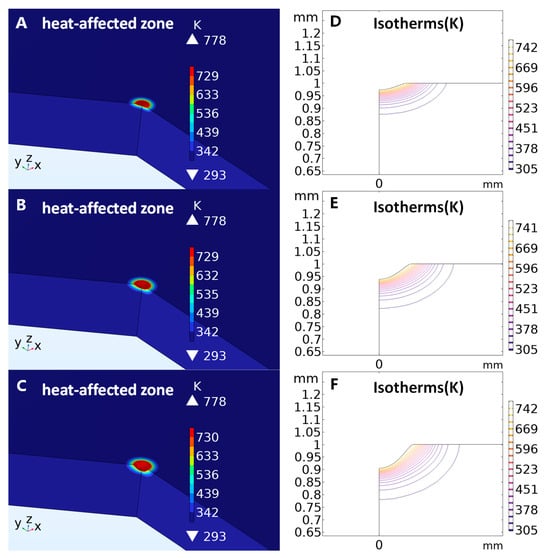 (A–C) illustrate the three-dimensional heat-affected zone and melt pool dimensions during laser welding on a platinum disk, whereas (D–F) present two-dimensional cross-sectional views of the melt pool. It is observed that with an increasing number of laser cycles, the melt pool size on the platinum disk progressively expands.