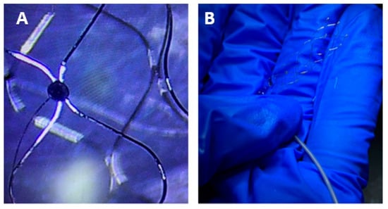 Subsequently, the electrodes were bonded to the stent using a UV-curable adhesive (Dymax 1128-A-M, UV Pacific, Edwardstown SA, Australia), which was cured under 365 nm UV light for 20 s. During the bonding process, care was taken to ensure uniform application of the adhesive to the contact area between the electrode and the stent. Each electrode was positioned precisely according to the results obtained from simulations. The fabricated laser welding endovascular stent electrodes are shown in Figure 4.