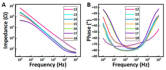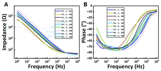 (A,B) Averaged EIS at different processing parameters (n = 6). It indicates the optimal choice for laser ablating the micro-wire. The impedance decreases correspondingly with the decrease in laser energy and the increase in processing times. At the same time, increasing the laser cutting marking speed was equivalent to increasing the laser energy.