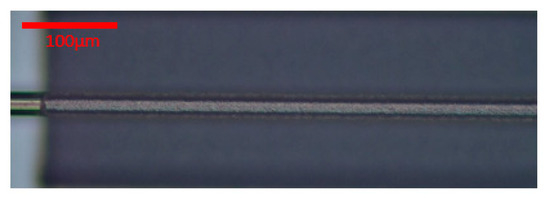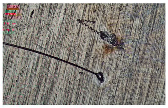 In the end, the laser cutting parameters were energy 19 μJ, scaling factor 5%, and the frequency divider 25. The marking speed and jump speed were both set to 200 200. Figure 6 shows the laser cutting image. Figure 7 shows the laser welding effect of the platinum disk and the micro-wire.