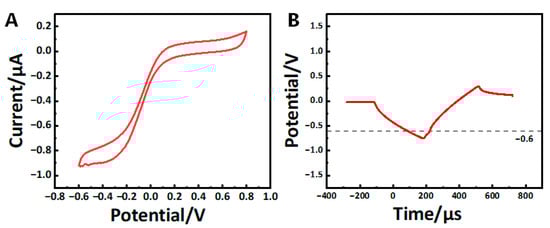 (A) Averaged CV curve of the electrode. (B) Averaged voltage transient curve of electrodes (n = 6).
