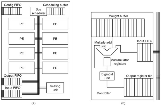 The Neural Processing Unit (NPU) is designed to accelerate computation-intensive operations or kernels within neural network models. These processors are primarily based on loop unrolling techniques or systolic array implementations [13,14,15]. Their computing power basically relies on the multiplication or accumulation unit (Digital signal processor, DSP) in the FPGA to achieve. The Tensor Processing Unit (TPU) [16], with its design concept shown in Figure 1, a TPU consists of 8 Processing Units (PE), and each PE calculates a neuron. TPU can save 97% of CPU instructions and achieve a maximum acceleration of 11.1 times. However, because of the architecture of the systolic array, these designs are unaware of the sparsity in Convolutional Neural Networks (CNNs) and perform poorly on both compute throughput and efficiency. Apple Silicon [17], particularly the M series chip, integrates a CPU, GPU, and a 16-core Neural Engine into a single SoC. Built on a 5-nanometer process, it delivers efficient parallel processing and accelerates machine learning computations, making it suitable for deep learning tasks. Tesla’s Full Self-Driving (FSD) computer [18] features a custom AI chip with a dual neural network accelerator, each chip features. Intel Xeon processors with High Bandwidth Memory (HBM) [19] offer high memory bandwidth and reduced latency, essential for deep learning workloads. The combination of Xeon CPUs and HBM provides fast access to large datasets and efficient parallel processing, making them ideal for data centers and high-performance computing environments. The NVIDIA Jetson Orin [20] platform features an Ampere architecture GPU, Arm Cortex-A78AE CPU, and a deep learning accelerator, delivering up to 200 trillion operations per second. It supports various AI frameworks, making it suitable for edge devices and applications requiring real-time AI processing, such as robotics and autonomous vehicles. However these dedicated processors are not specifically designed for unstructured sparse neural networks, or their parallel processing architecture cannot achieve good energy efficiency gains in performing unstructured pruning neural networks.