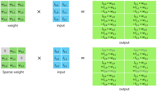 Unstructured pruning generally operates at the granularity of individual neurons, in contrast to structured pruning [35], which is based on filters, channels, or even entire layers. Unstructured pruning prunes parameters directly, which offers several advantages. It is straightforward, as setting a weight to zero within the parameter tensors effectively prunes a connection. Deep learning frameworks like PyTorch provide easy access to all network parameters, simplifying implementation. The primary benefit of pruning connections is that they are the smallest and most fundamental elements of networks, allowing for extensive pruning without affecting performance. This fine granularity enables the pruning of subtle patterns, even within convolution kernels. This weight pruning is unconstrained and the most precise method. This difference in granularity results in irregular pruning patterns for unstructured pruning [36], whereas structured pruning yields more regular patterns. For general-purpose accelerator hardware such as CPUs and GPUs, structured pruning is more effective in deployment due to its regular sparse granularity and unstructured pruning may not provide performance improvement. However, for specialized neural network processors, unstructured pruning is more attractive as it can better reduce the memory footprint and computational workload of DNN models. As illustrated in Figure 2, a pruned weight can be skipped right in the convolution operation, in a dedicated designed architecture. Recent foundational research on unstructured pruning has focused on effectively training and identifying “winning tickets” [37,38], which are subnetworks within dense neural networks that can match the original network’s test accuracy after the same number of training iterations.