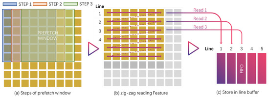 As mentioned in Section 1, data loading and reuse are very important, so we carefully designed an efficient data loading unit. The data loading unit is designed using strategies such as sliding windows and row registers, illustrated as the flowchart in Figure 11. In the following, we describe the design of the storage circuit from the perspective of loading and reading in Figure 12. We know that the convolution kernel slides on the feature map to perform an accumulation operation, so in the same row, two adjacent convolution operations generally slide to the right. Let’s take a convolution kernel with a size of and a stride of 1 as an example: the feature map corresponding to the multiplication of the first point of the second convolution kernel is consistent with the feature map corresponding to the second point in the first convolution, and the sliding window is based on this idea. The data read once can make the reusable data in multiple convolutions not have to be read repeatedly, thereby improving efficiency. On the other hand, when a convolution kernel slides horizontally, any value in it is multiplied with a row of continuous feature maps in the same row, and this part can be operated at the same time. Therefore, the union of a row of feature maps corresponding to each value on the convolution kernel and the number required in the sliding window is still a continuous row. We retrieve this row of continuous feature maps from outside the chip and store them in the feature map memory. Figure 13 illustrates the design of the row memory.