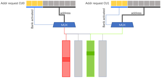 Mapping feature maps into groups and organizing them into segments during convolution is the method used by the accelerator to schedule tasks for the computing units during operation as illustrated in Figure 8. We use on-chip SRAM to store feature maps. Because the stored feature maps are non-sparse, each SCU accesses the feature maps according to the location of non-zero weight values (Weights). Considering that SRAM has only one write port and one read port, the SRAM in the same group can only read feature map data at one address at the same time, that is, the same clock can only serve one SCU. To this end, we divide the feature map memory into multiple groups, that is, multiple banks, and there is no congestion problem when different SCUs access different banks. It is necessary to consider choosing a simple and efficient method to divide the feature map into different groups so that the number of memory accesses to obtain the feature map corresponding to the weight on each convolution kernel is as equal as possible. When storing the feature map, we assume that the feature map corresponding to the weight is randomly and equally distributed, and using direct mapping can reduce complexity. Therefore, using the Least Significant Bit (LSB) or the Most Significant Bit (MSB) is able to map the feature map to the memory of different groups with high accuracy. Experiments show that we use LSB as the code to distinguish banks to obtain higher performance.