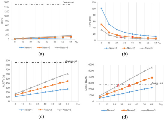 DSE of the design parameters. (a) shows the DSPs usage over after floorplanning. And the roofline limited by device is marked as dotted line. (b) shows the wall time of network reference over . The optimum design is marked in a red star. (c) shows the ALUTs usage with the increase of the parallel. and (d) shows the on-chip RAMs usage over , and the optimum design is found by the elimination of device resource, marked in red star.