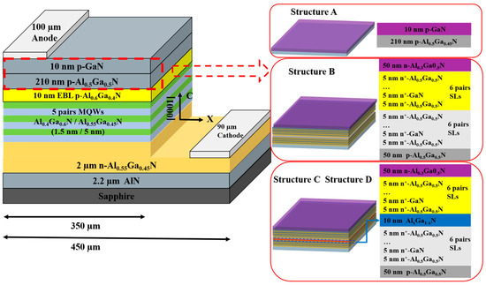 The 2D AlGaN/AlGaN UV LED structure constructed using APSYS (2016 version) simulations is shown in Figure 2. Structure A adopted the conventional UV LED structural model developed by Wang [30], structure B was a superlattice tunnel junction UV LED structural model, structure C was a superlattice tunnel junction UV LED structural model with dielectric layer Al0.4Ga0.6N, and structure D was a superlattice tunnel junction UV LED structural model with dielectric layer Al0.6Ga0.4N. The three structures were identical except for the different p-type layers. The structures of the AlGaN-based UV LEDs were, from bottom to top: the c-planar sapphire substrate; the AlN buffer layer with a thickness of 2.2 µm; the n-Al0.55Ga0.45N layer with a thickness of 2 µm (n-type dopant concentration of 3 × 1019 cm−3) [31]; the multiple quantum well (MQW) stack containing 5 pairs of A0.4Ga0.6N/A10.55Ga0.45N wells/barriers with thicknesses of 15 nm and 5 nm, respectively; and the p-Al0.6Ga0.4N EBL layer with a thickness of 10 nm (p-type doping concentration of 3 × 1019 cm−3). The p-type region of structure A with a thickness of 210 nm was the p-Al0.5Ga0.5N layer p-Al0.5Ga0.5N layer (p-type doping concentration of 3 × 1019 cm−3), and the thickness of the p-GaN layer was 10 nm (p-type doping concentration of 3 × 1019 cm−3).