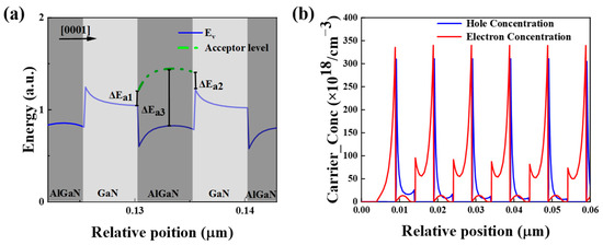 In order to study the change of p-type activation energy of the superlattice, we compared the activation energy of the superlattice at the barrier. In Figure 3a, we find that at the barrier AlGaN, the activation energy drops to Ea3, and the hole excitation energy is reduced compared to the traditional p-type layer. To determine whether the carrier concentration in our designed superlattice tunnel junction met the required level for tunneling, we calculated the electron and hole concentrations induced by the superlattice structure. As shown in Figure 3b, the average electron concentration generated by the n+-Al0.5Ga0.5N/n+-GaN superlattice structure is 1.7 × 1020 cm−3. In Figure 3, the hole concentration produced by the p+-Al0.5Ga0.5N/p+-GaN superlattice structure is 3.1 × 1020 cm−3, which satisfies the carrier concentration criterion for tunneling in tunnel junctions.
