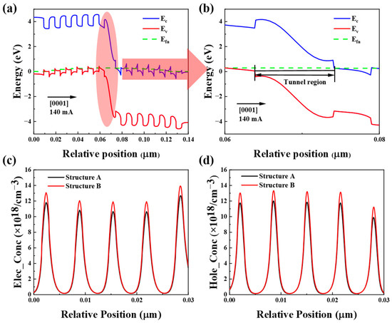 (a) Structure B tunnel junction band, (b) tunnel junction enlargement, (c) electron concentration and hole concentration of structure A, and (d) electron concentration and hole concentration structure B in MQW region at an injection current of 140 mA.