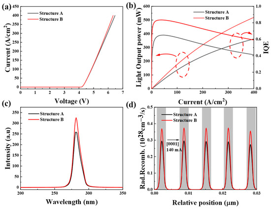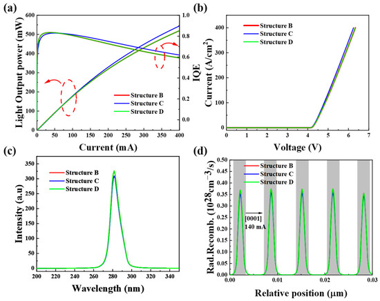 Figure 9b compares the I–V characteristic curves of the three structures, revealing that structure C achieves the highest current at a given voltage, likely due to its lower tunnel junction resistance. Figure 9c presents the electroluminescence (EL) spectra of the three structures, all of which emit at a wavelength of 280 nm, with structure D exhibiting the highest luminescence intensity. Finally, Figure 9d shows the radiative recombination rate in the active region for each structure. The grey background represents the quantum well region. Structure D achieves the highest radiative recombination rate, attributed to its higher tunneling probability and increased hole concentration in the active region.