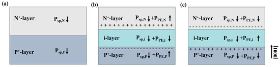 Then, we further studied its induced spontaneous polarization and the effect of piezoelectric polarization on the stress change of the dielectric layer, as shown in Figure 6. Due to the spontaneous and piezoelectric polarization of the p+-i-n+ heterojunction, the stress of the traditional tunnel junction comes from the spontaneously polarized Psp,N and Psp,P, while the stress of the polarized tunnel junction comes not only from the spontaneous polarization but also from the piezoelectric polarization of the i layer under the action of compressive or tensile stress PPE,i. Therefore, when layer i is subjected to compressive stress, the spontaneous polarization of layer n, layer i, and layer p is opposite to the growth direction, the piezoelectric polarization of layer n and layer p is the same as the growth direction, and the piezoelectric polarization of layer i is opposite to the growth direction. Therefore, when the i layer is subjected to tensile stress, the piezoelectric polarization of the n layer and the p layer is opposite to the growth direction, and the piezoelectric polarization of the i layer is the same to the growth direction. Due to the difference in stress, the coupled electric field strength of the tunnel junction is also affected. The coupled electric field strength E of the polarized tunnel junction is calculated as follows [30]: