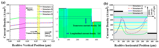 In Figure 8b, all four structures display an uneven current distribution due to the lateral structure, with higher current density from 0 μm to 125 μm and lower density from 125 μm to 300 μm. However, in structure A, due to homogeneous resistance, current preferentially flows into the MQW along the shortest conductive path, leading to a highly uneven lateral current distribution in the MQW. By contrast, tunnel junctions B, C, and D comprise multilayer materials with varying conductivities, which create transverse conductive channels at material interfaces, thereby enhancing the lateral uniformity of current density.