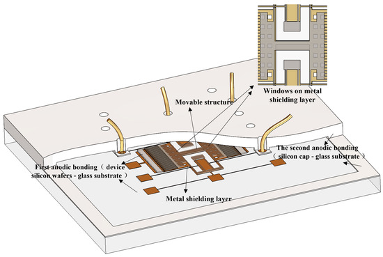 To address this issue, a metal shielding layer was designed to reduce the electric field intensity between the device and the substrate, thereby suppressing the electrostatic pull-in phenomenon. The metal shielding layer is required to reduce the electric field intensity between the device and the substrate during the secondary anodic bonding process while ensuring that the shielding layer does not affect the normal operation of the device, particularly the electrical signal transmission and structural stability. Additionally, it must meet the manufacturing process requirements to avoid increasing the process complexity due to the shielding layer’s design. Considering that the bottom structure of some devices may have specific requirements for electrical connection or optical performance (e.g., the substrate must be perforated or transparent), the design of the metal shielding layer needs to balance the practical requirements of both full coverage and windowed configurations.