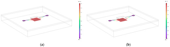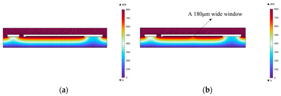 Figure 5. Simulation of electric potential (a) without a window and (b) with a 180 μm × 180 μm window.