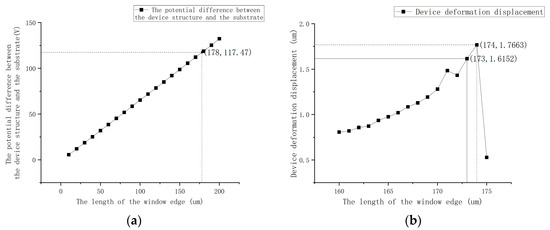 Figure 6. (a) The relationship between the window edge length and the potential difference (V) between the device and the substrate. (b) The relationship between the window edge length and the device deformation size.