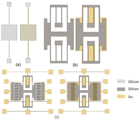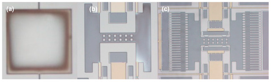 Figure 9. Morphologies of (a) the simple structure, (b) the comb-free movable structure, and (c) the resonator structure after secondary bonding without a metal shield.