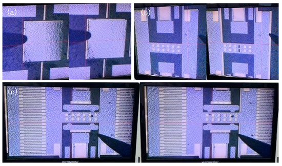 Since the device could not be seen through the metal layer due to observation through the glass substrate, we opened the packaged chip and used a probe to push the plate. By observing under a microscope whether the plate could be moved, we determined whether it had adhered due to pull-in. The morphology of three structures without a metal shielding layer after the second anodic bonding process is shown in Figure 9 under a 63× magnification using a microscope. Experimental results show that failure occurred in simple structures, structures without comb fingers, and resonator structures when no metal shielding layer was added. By using a probe to gently push the movable part of the structure, it was observed whether it could move, thereby determining whether the device experienced pull-in failure, as shown in Figure 10. After adding the metal shielding layer, the structures could be moved by the probe. The experimental results indicate that the addition of the metal shielding layer effectively prevented device failure during the second bonding process.