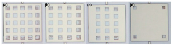 Figure 11. Observation of the different quantities and morphologies of metal-layer windows through the glass substrate side: (a) 25 windows, (b) 20 windows, (c) 15 windows, (d) 4 windows.