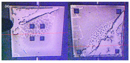 Figure 12. The black substance on the metal layer after secondary anodic bonding. (a) Structure with 4 windows in the center (b) Structure with 4 windows around the edges