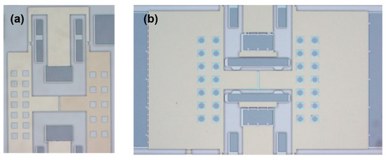 Figure 13. (a) Microscope view of the movable part of the comb-free structure from the substrate side; (b) microscope view of the resonator structure from the substrate side.