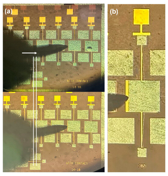 Based on simulation and theoretical calculations, square windows with edge lengths ranging from 160 μm to 190 μm were designed. After the second anodic bonding, the internal test structures were evaluated. The movable parts of the test structures were manipulated using a probe on a probe station. The experimental results are shown in Figure 14. In Figure 14a, when the probe was used to push the device structure corresponding to a metal layer window with an edge length of 190 μm, the device could not be moved even after pushing a certain distance, indicating that the structure had failed. Figure 14b shows that the device structure corresponding to a window with an edge length of 180 μm could be easily moved by the probe. In the experiment, none of the test structures with window edge lengths smaller than 180 μm experienced pull-in to the substrate during or after the second bonding, which is consistent with the simulation and theoretical calculation results.