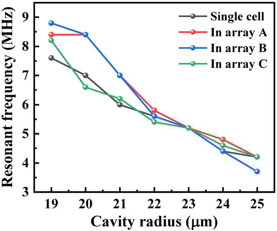 At high resonance frequencies, the phase peaks are also not very pronounced. Therefore, we took the relatively more distinct C-type array as an example, and a laser Doppler vibrometer (LDV, OFV 512 and OFV3001, Polytec, Baden-Württemberg, Germany) was used to further measure the actual resonant frequencies of cells with varying cavity sizes, which were 12.723 MHz, 11.663 MHz, 10.7 MHz, 9.859 MHz, 9.093 MHz, 8.439 MHz, and 7.865 MHz. These were compared with the resonant frequencies obtained from the finite element simulations of single cells and showed good agreement (Figure 8d).