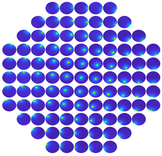 Each response function can be measured by sequentially applying unit control signals to each actuator. For the 97-element DM used in this paper, we obtained 97 response functions corresponding to its actuators. Figure 2 illustrates the actual 97 response functions of the DM, where each function’s position corresponds to the respective actuator position shown in Figure 1.
