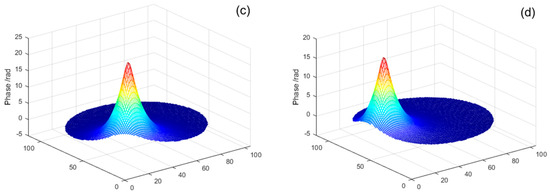 Three-dimensional diagrams of the response functions for several actuators in typical positions, where (a–d) are for actuator 25, 49, 73, and 81, respectively.