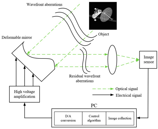 The aberrant wavefront is reflected by the DM and directed onto the image sensor through the imaging lens. The control module acquires imaging information from the image sensor and generates control signals of DM using specific control method based on imaging information. These control signals are then applied to the DM actuators via a high-voltage amplifier, resulting in the generation of compensation phases. Subsequently, the residual wavefront serves as the input for further closed-loop correction until predetermined conditions are satisfied.