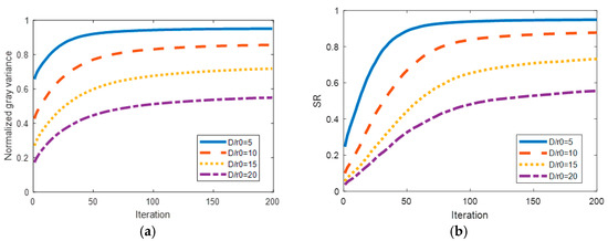 Averaged normalized gray variance and SR curves under four different turbulence levels, where (a) is for normalized gray variance and (b) is for SR.