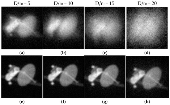 Imaging results before and after correction under different turbulence levels by a single phase screen when the SNR is 10, where (a–d) are for images before correction and (e–h) are images after correction.