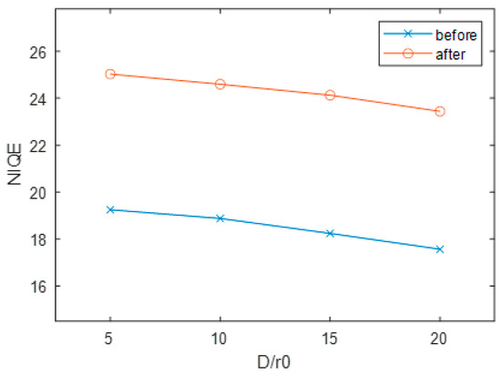 Then quantitative method is used to analyze the effect of the extended object imaging correction. The Natural Image Quality Evaluator before and after imaging correction under four different turbulence conditions was calculated according to Equation (5) in Section 3.1, and the results are presented in Figure 7. It can be observed from Figure 8 that the values of have significantly improved after correction compared to those before correction, with an increase of more than 30% in imaging effects under all four turbulence conditions. Particularly, when the turbulence level is high, the metric increases from 17.56 to 23.44. This demonstrates that even under strong turbulence levels, the utilized DM exhibits a robust correction capability.